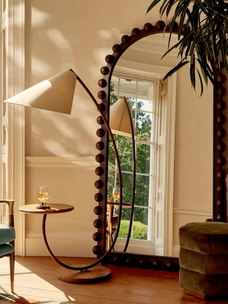 Metal: luminárias redondas, objetos cromados, cristais, espelhos circulares e castiçais