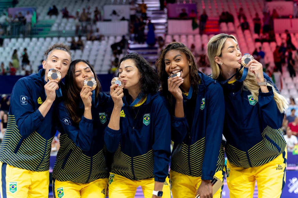 Na foto, as medalhistas de bronze Rebeca Andrade, Jade Barbosa, Lorrane Olivera, Flavia Saraiva e Julia Soares comemoram.Na foto, a ginasta Jade Barbosa durante a fase qualificatória.2024.08.03 – Jogos Olímpicos Paris 2024 – Ginástica Artística feminino. A brasileira Rebeca Andrade em ação na final do salto. A brasileira ganhou a medalha de prata. Foto: Wander Roberto/COB