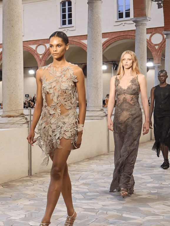 A Fendi, abriu o #MFW. Apresentou sua coleção de verão 25 com foco nos tons pasteis, transparência e muito tênis no styling de looks mais noite. A combinação da casa em técnica, cores e um jazz moderno, com elementos da década de 1920.