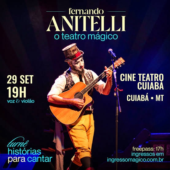 Fernando Anitelli chega à Cuiabá no dia 29 de setembro com sua mais nova turnê do Teatro Mágico, “Histórias para Cantar”. O projeto composto por músicas de gênero POP/MPB traz ao público um ambiente nostálgico do Teatro Mágico, incentivando a participação ativa da platéia. Aapresentação ocorrerá no Cine Teatro de Cuiabá-MT.
