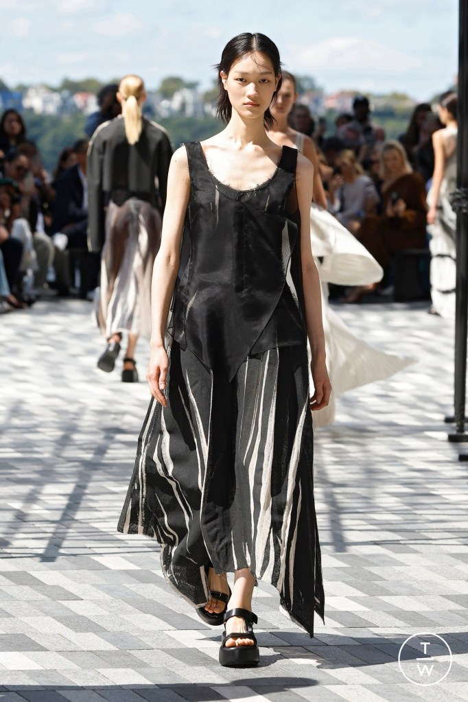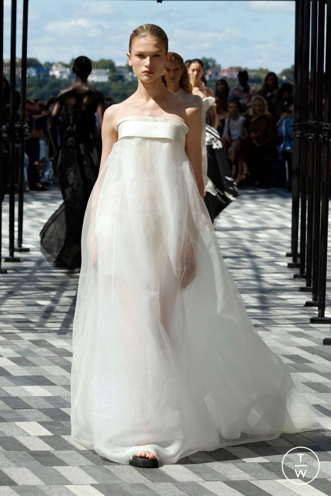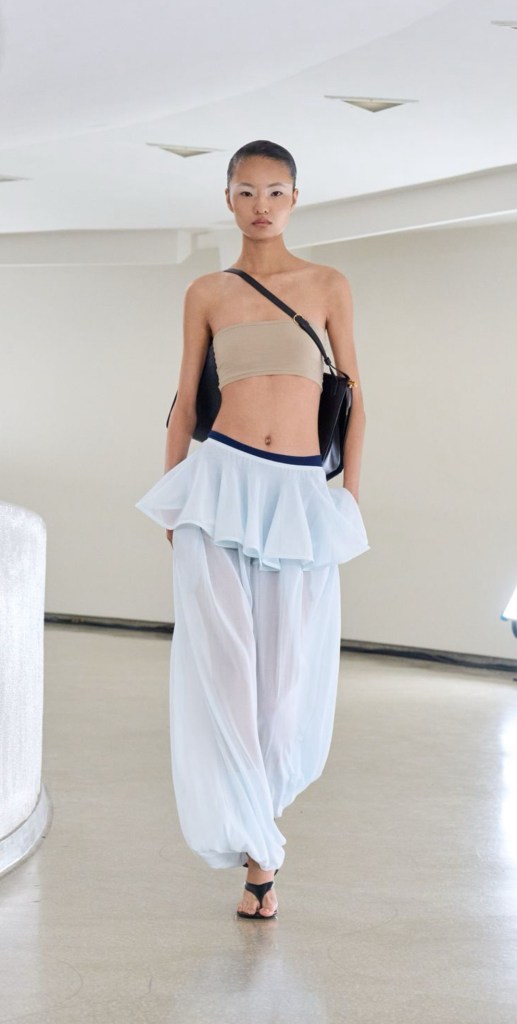 Cortes retos em vestidos tomara que caia, assimétricos com drapeados, decotes que uniram a oposição entre formas de maneira fluída. E muita, muita combinação de calças com vestidos e batas.