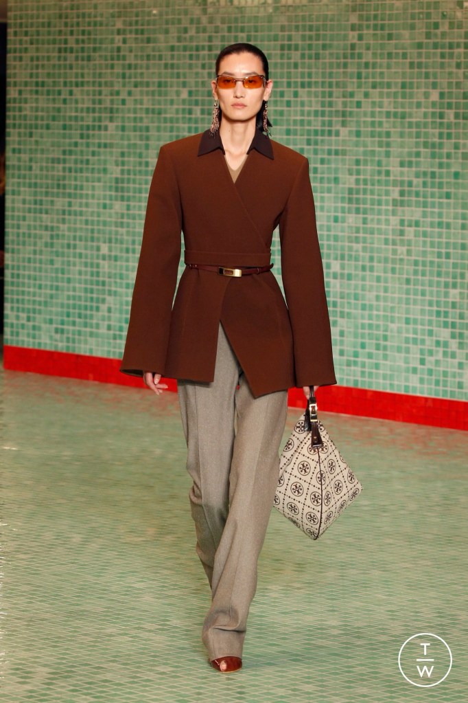 Blazers estruturados com cintura marcada, blusas e calças com modelagem reta, vestidos drapeados e babados, essas são as características-chave das composições de Tory Burch. Ao juntar tons sóbrios e terrosos a essas silhuetas, a coleção passou uma visão séria.