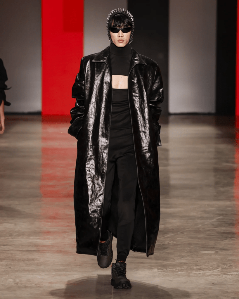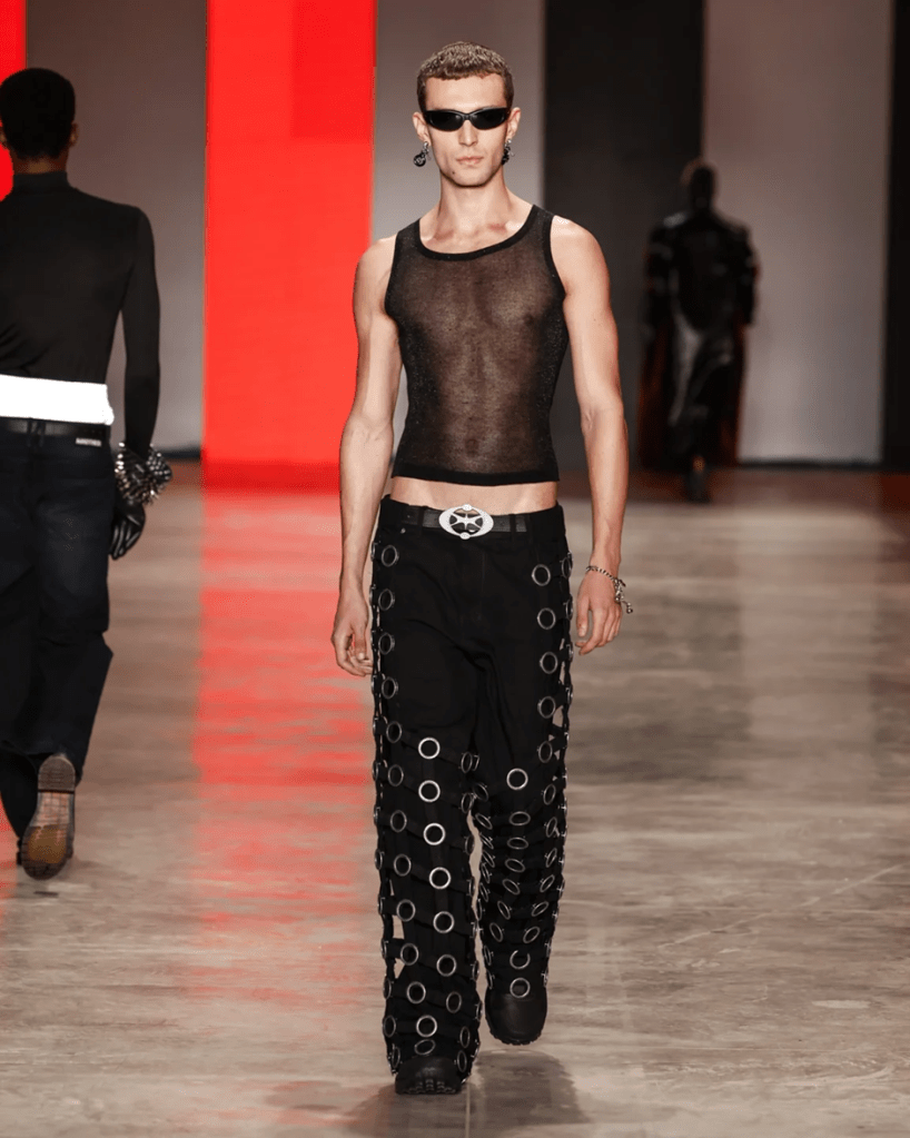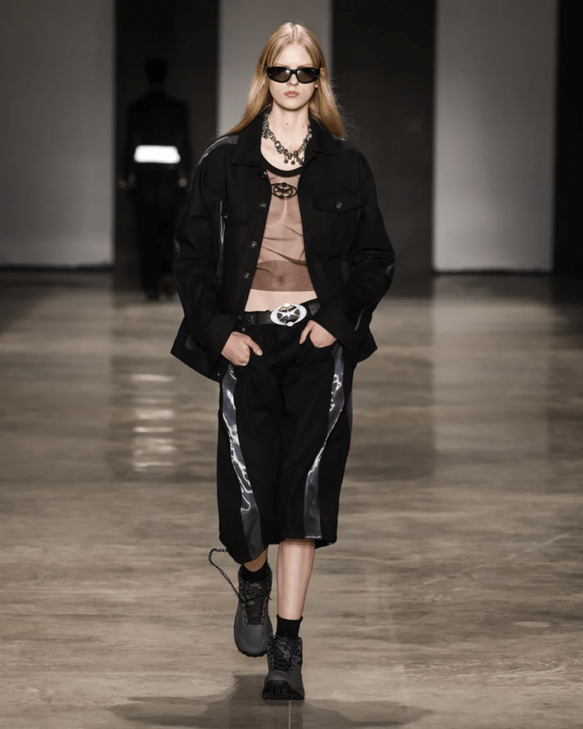 Os visuais com vibe de Balenciaga e Diesel exploraram transparência, jeans, acessórios prateados e óculos escuros, roupas usadas pela grande maioria do público dessas raves que acontecem em galpões e prédios abandonados em São Paulo.