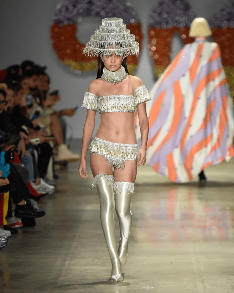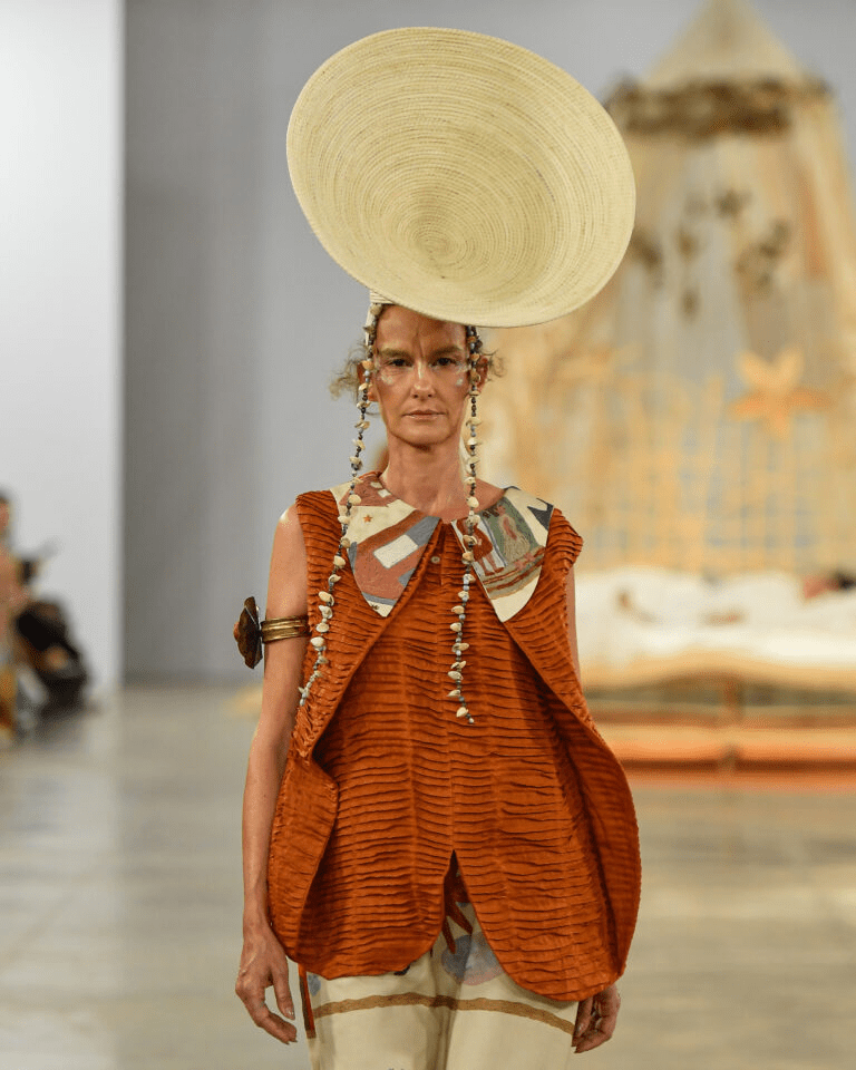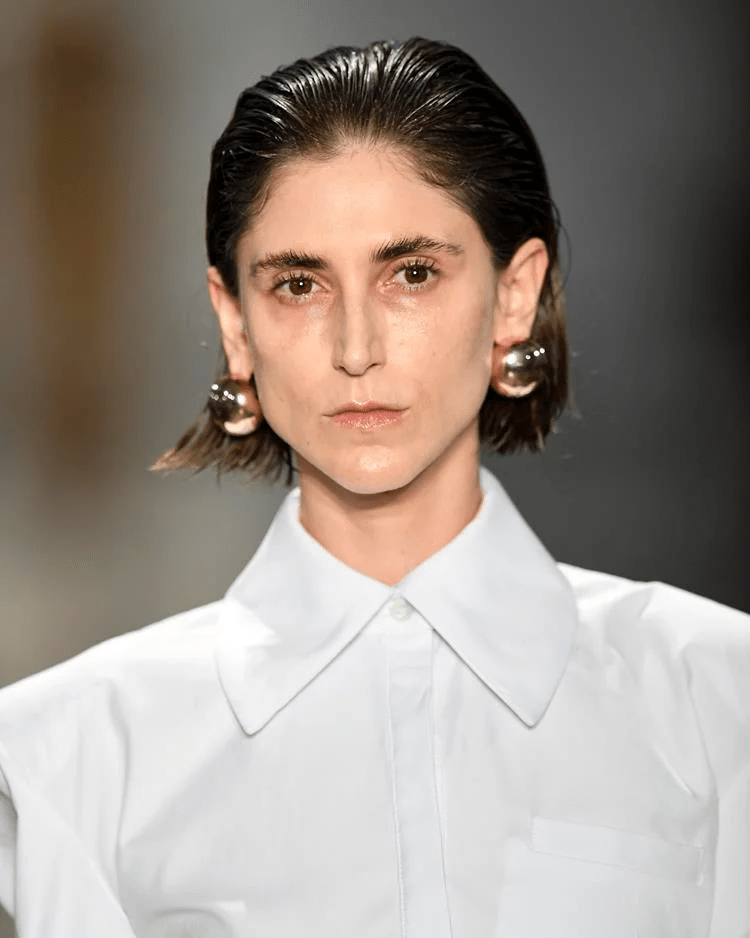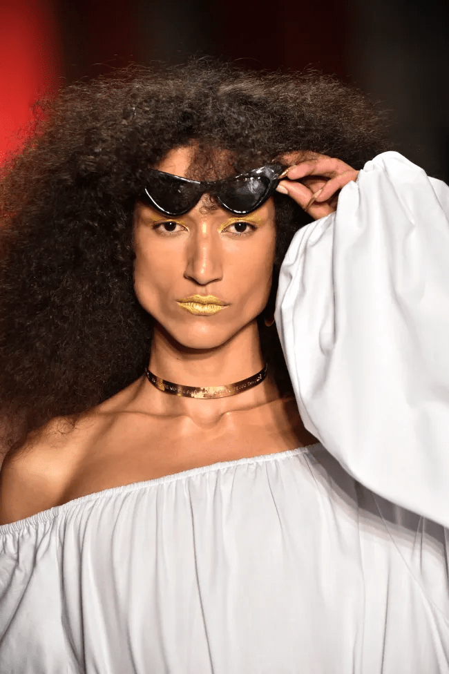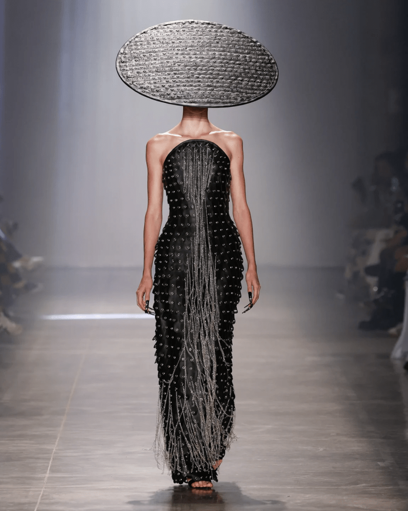 O prata esteve presente em pontos específicos da maquiagem de Artemisi, bem como em seus acessórios e longas unhas. Os volumosos chapéus redondos entregaram a geometria para a proposta futurista da coleção.