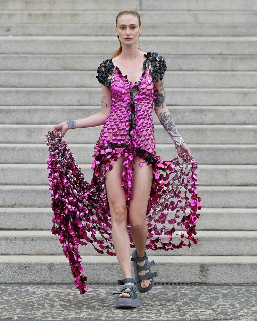 O primeiro look apresentado foi com um top feito com cuias de tacacá, e o ponto alto da apresentação, foram vestidos que receberam escamas, bolsas em formato de peixe e peças que se assemelham a cascas de árvores.
