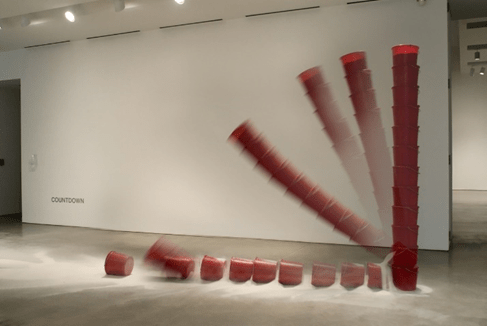 A obra é dividida em dois momentos. O primeiro, uma performance, onde o furo simboliza a fragilidade do que parece forte – a coluna que irá ao chão. E no segundo momento, a escultura está no chão, inerte. O que resta é a memória de quem viu a ação e a reflexão sobre o que ela representa. Countdown, o nome da exposição, é quase uma contagem regressiva para o colapso.