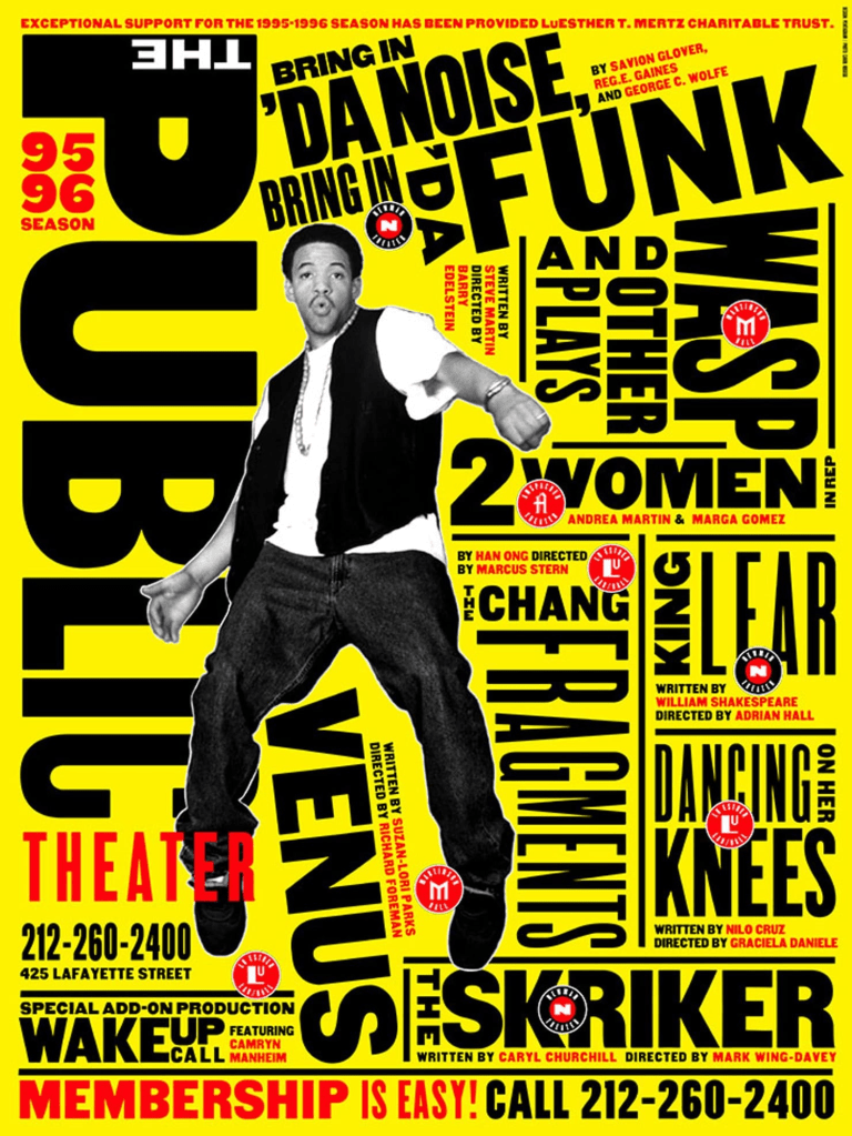 A campanha de 1994 para o musical Bring in ‘da Noise, Bring in ‘da Funk marcou uma revolução. As letras ocupavam todo o espaço, sem medo, criando um ritmo visual que refletia a batida do espetáculo. Essa abordagem deu um novo significado ao design teatral, tornando-o mais acessível e dinâmico.