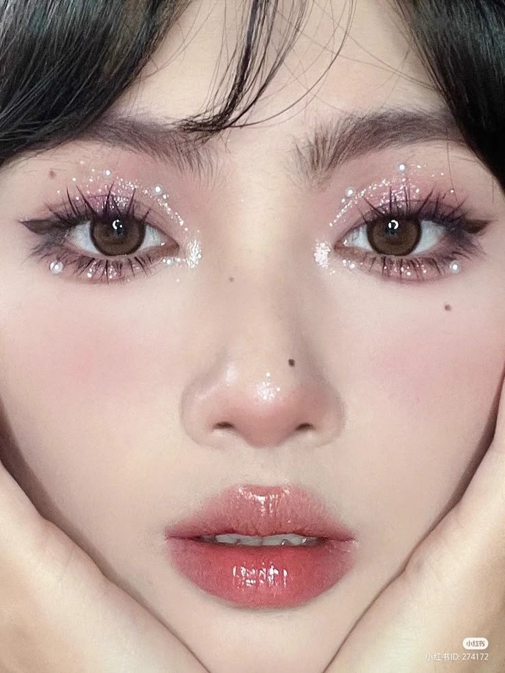 A parte mais importante da make! Utilize sombras cintilantes ao longo do olho, e aposte em glitters com partículas mais grossas na parte interna. Para o delineado, alongue um pouco sua cauda e deixe-a bem fininha. E não se esqueça de se divertir desenhando os cílios inferiores para dar esse efeito doe-eyed!