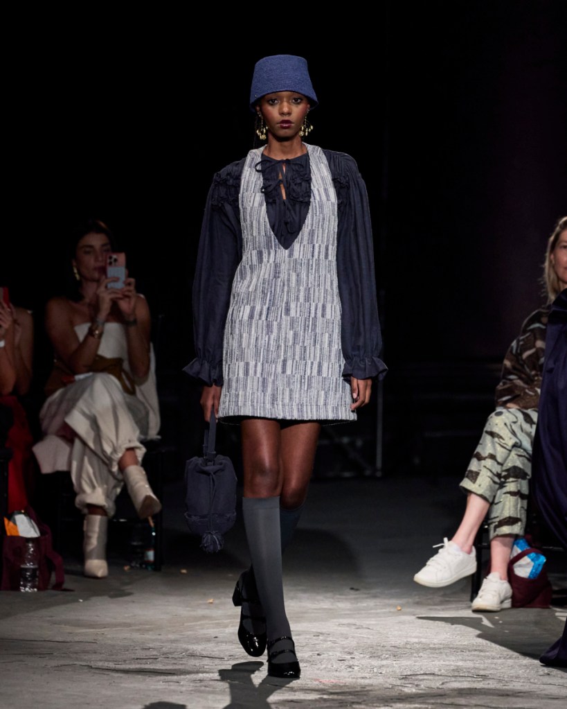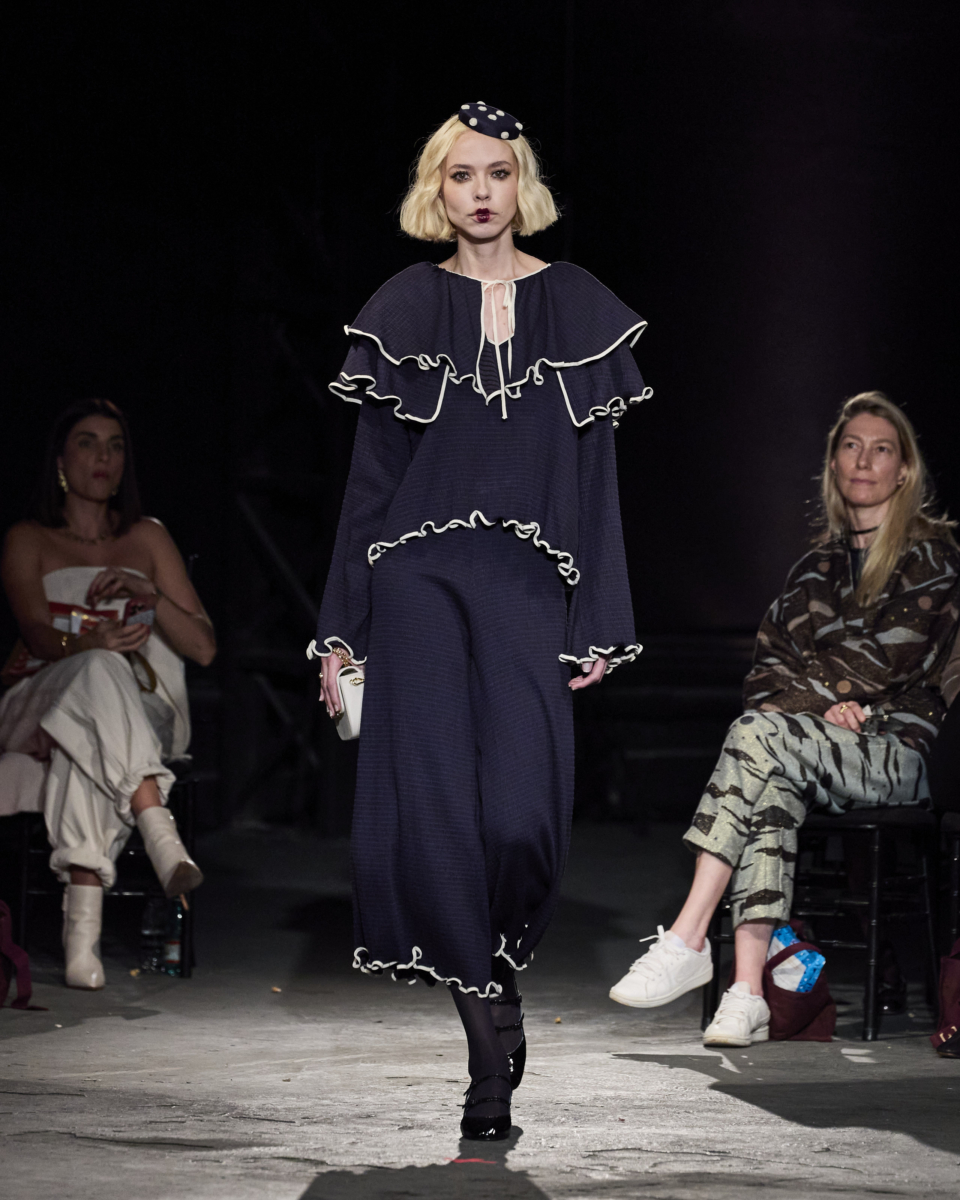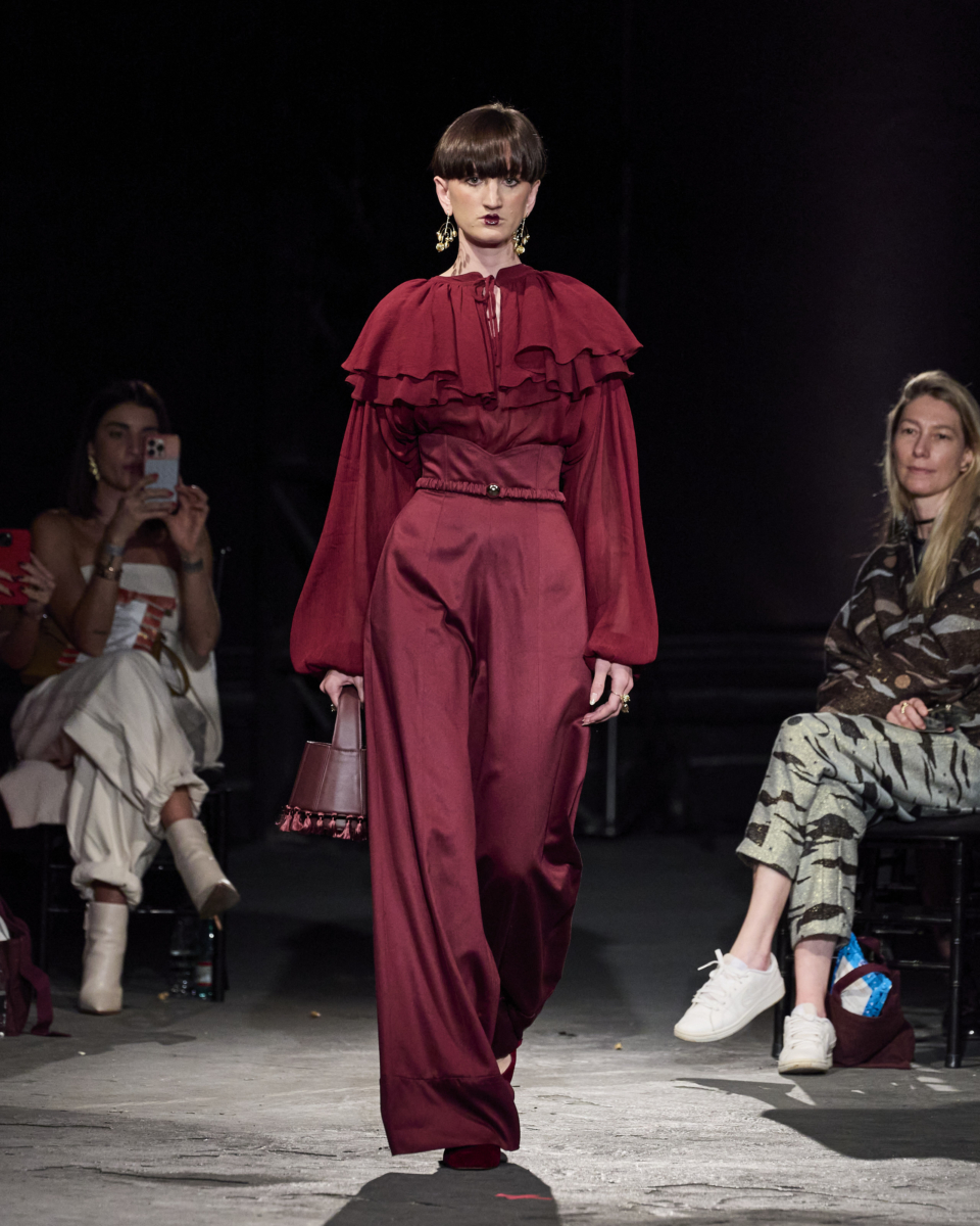 As peças trouxeram modelagens com foco na cintura, mangas com variações estruturadas, camadas de babados e sobreposições. Os tecidos exploraram contrastes: organza, chiffon e malhas leves dividem espaço com jacquards pesados e alfaiataria encorpada.
