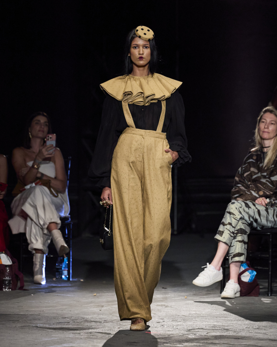 A apresentação combinou referências visuais do universo circense — como golas com volume, botões arredondados, pom-pons e acessórios de cabeça desenvolvidos com a marca Matilda — com silhuetas já apresentadas no repertório da marca.