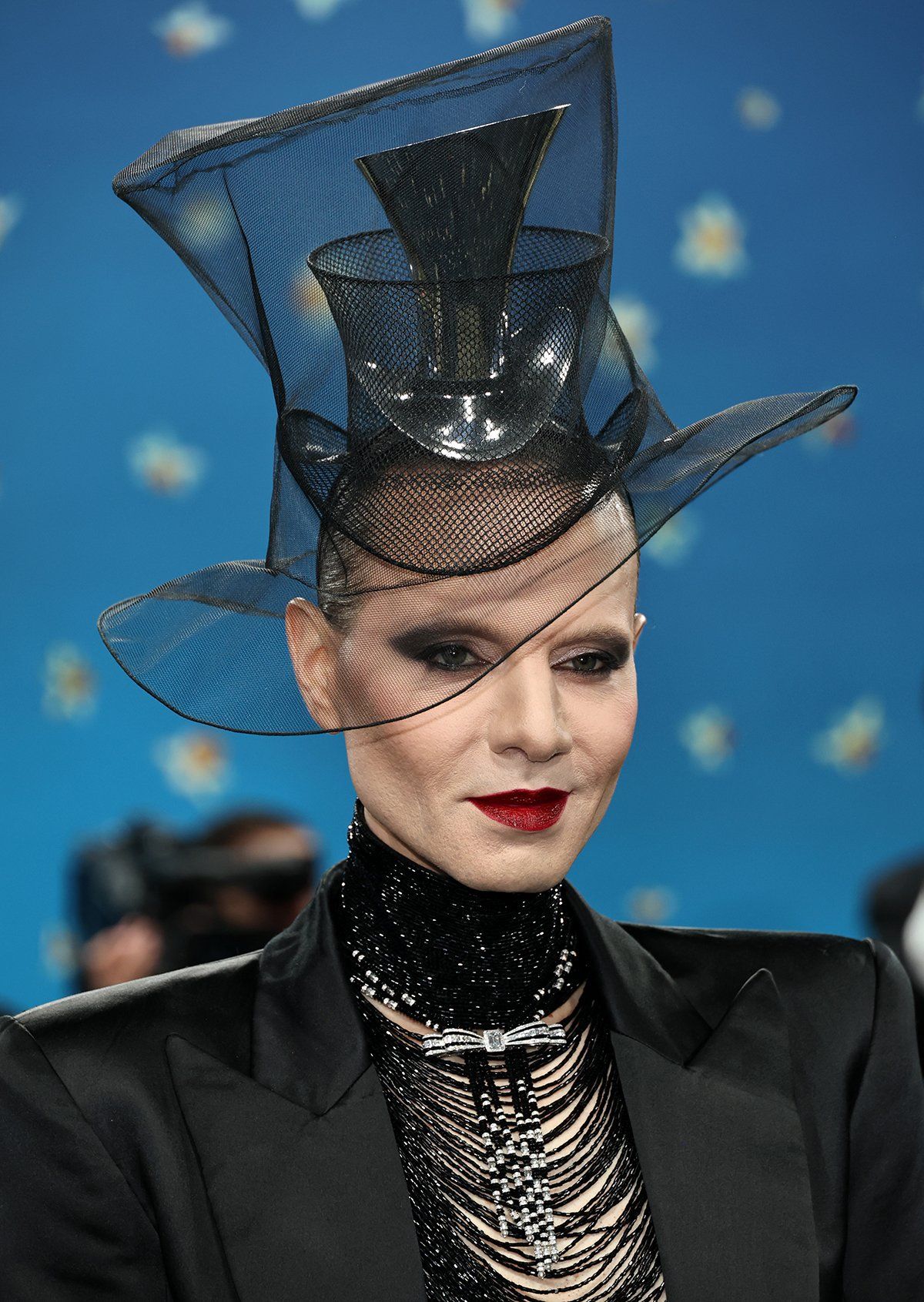 O look descontruído, inspirado no estilo ilusório trompe l’oeil, foi arrematado com um chapéu-coco preto com contorno e listras prateados, além de sustentar um monóculo no olho esquerdo.