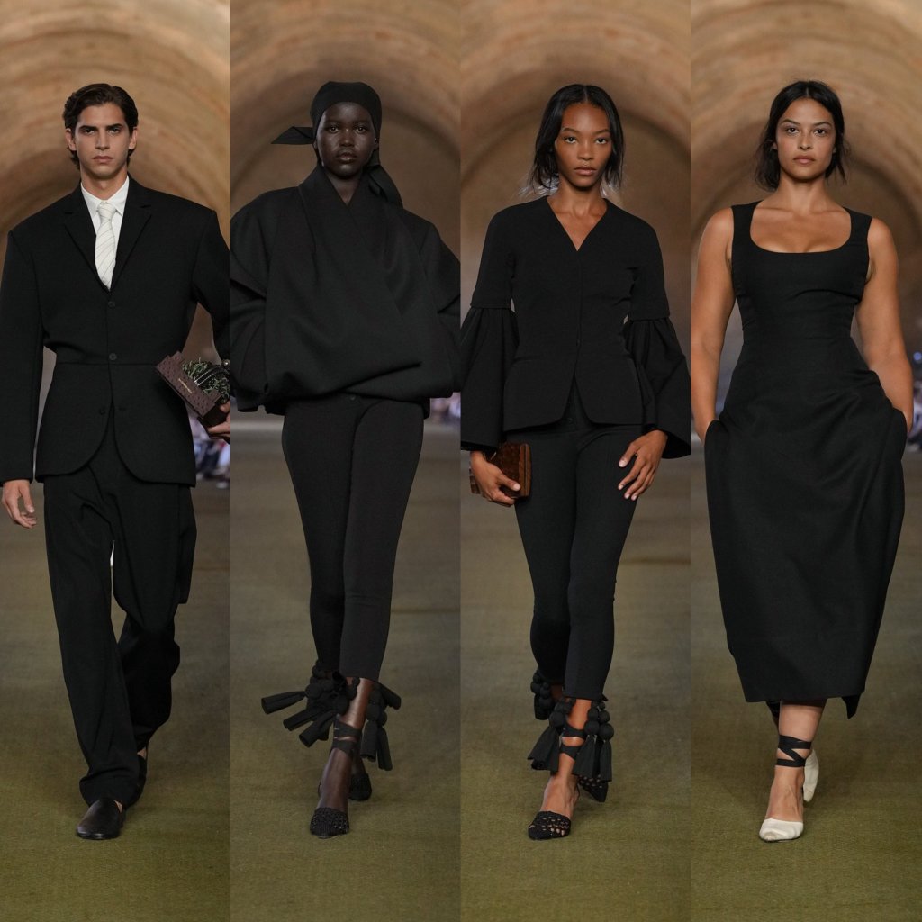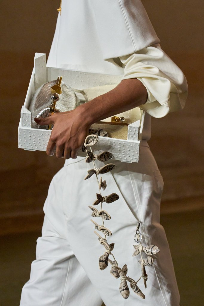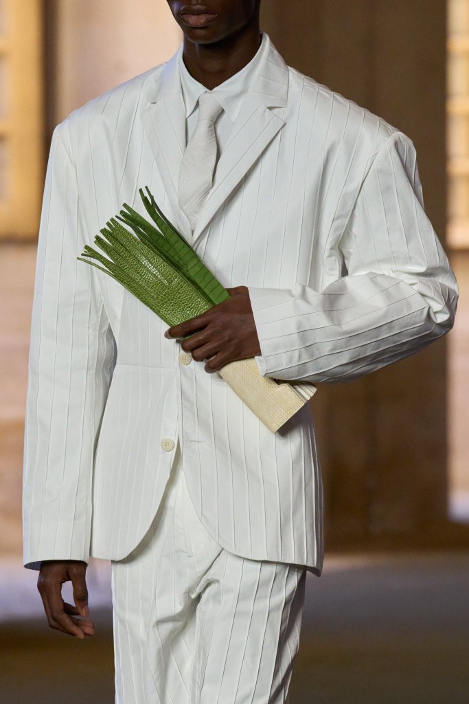 A coleção traz referências divertidas ao cultivo, como alhos-porós feitos de couro, guirlandas de alho e joias em forma de frutas. Já os acessórios, como boinas, xales e espadrilles, dão profundidade ao devaneio rural. Um terceiro destaque é o novo modelo de bolsa, “Le Valerie”, batizada em homenagem à mãe do estilista.