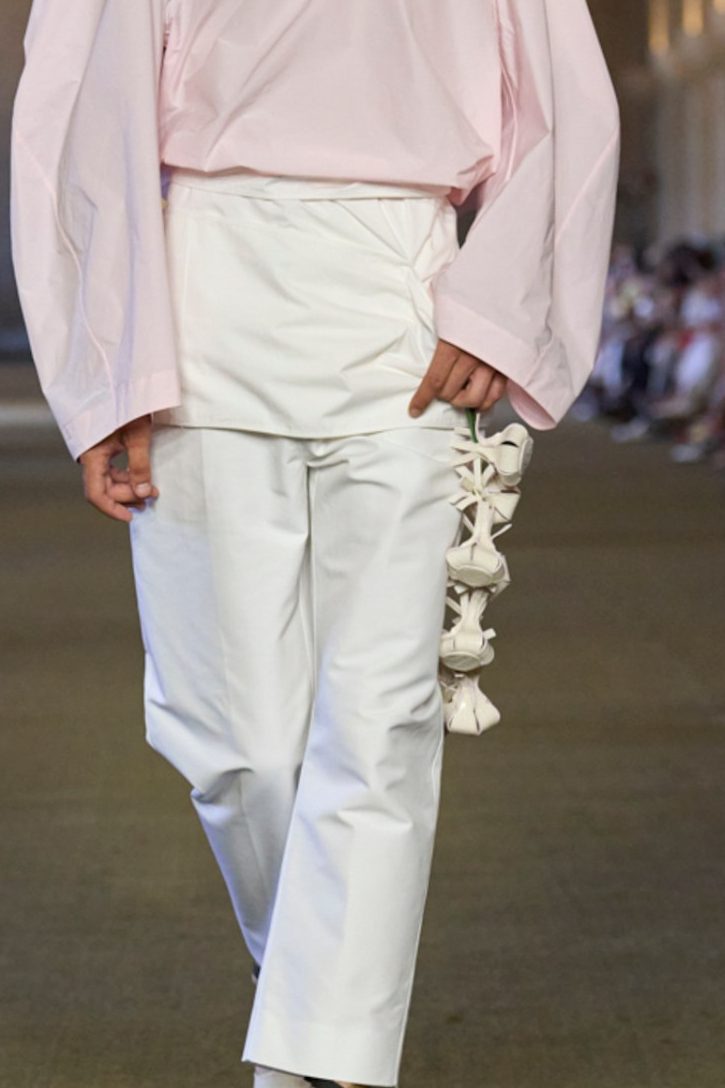 Simon Porte Jacquemus não apenas voltou ao calendário oficial da Paris Fashion Week, mas retornou ao Palácio de Versalhes após dois anos. A escolha da locação, mais especificamente a L’Orangerie, espaço sem adornos dentro da opulência do castelo, é simbólica. O desfile tensiona a distância entre o glamour da aristocracia e a realidade do camponês, da terra, do suor, da colheita.