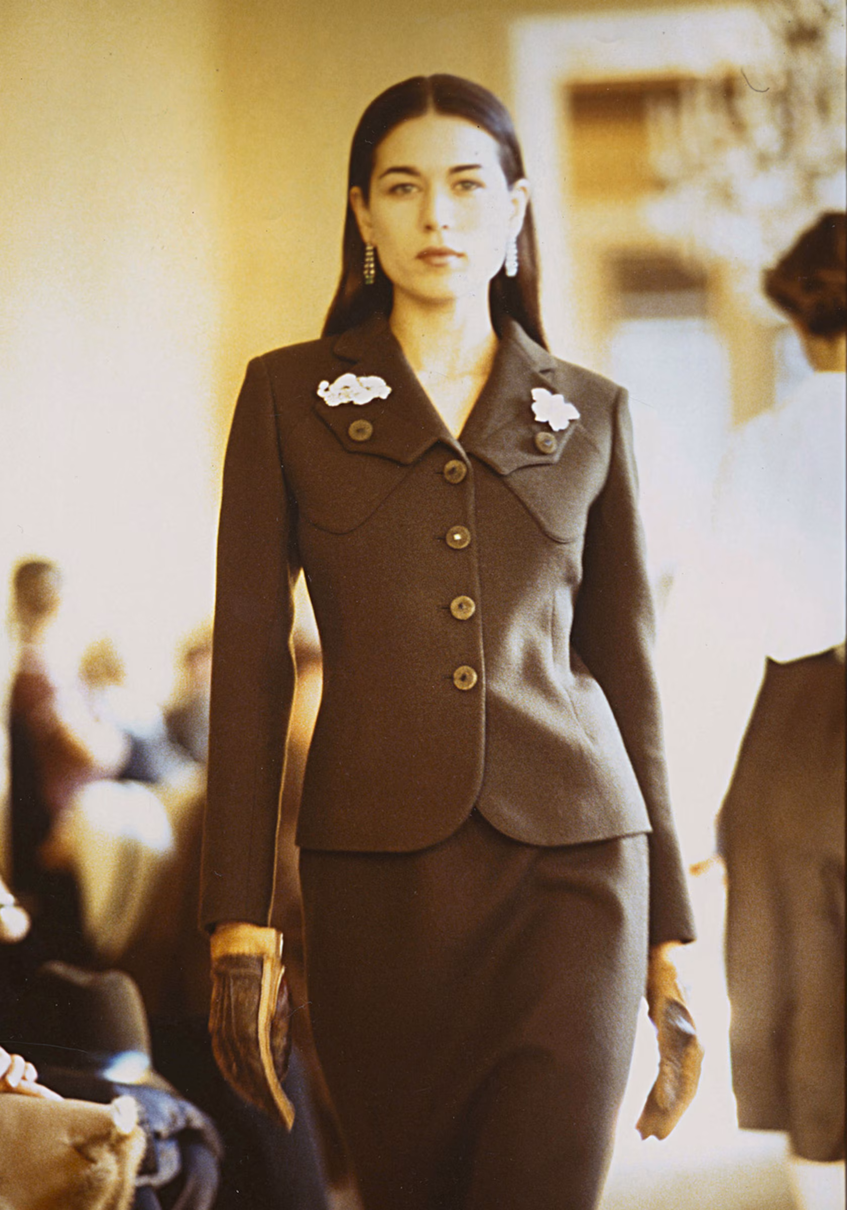 Nesse desfile, as roupas foram comportadas, um pouco masculinas, com acessórios militares, como boinas e alusão a uniformes de guerra. Mas foi aí que Miuccia surpreendeu: de forma sutil, mas estratégica, ela subverteu elementos da moda fascista. Por exemplo, fez vestidos com silhuetas tradicionais, mas colocou cores vibrantes como rosa, vermelho e amarelo.