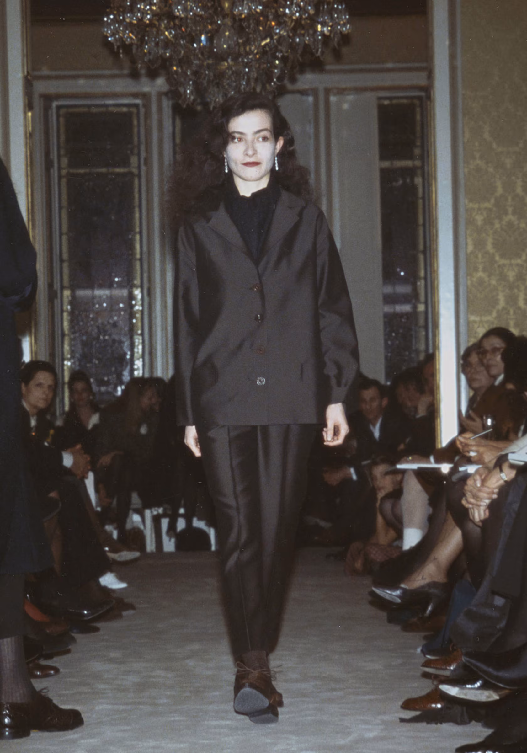 Se baseando em casacos militares, ela remodelou a peça, recortando-o de uma forma que fizesse alusão aos seios femininos. Em outros looks, ela abusou da cor preta, decotes fechados, alfaiataria e comprimentos abaixo do joelho. Ela desviou os valores ultra conservadores e patriarcais, fazendo com que a coleção fosse, de forma proposital, “feia” e sem graça.