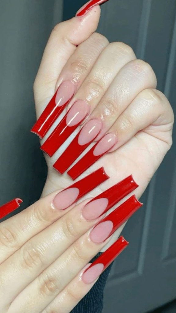 A manicure “deep French” ecoa exatamente isso, é chamativa, mas sofisticada, resgatando um ícone da beleza Y2K e trazendo-o para o presente com personalidade. O detalhe é que esse formato de French mais grosso e menos delicado tem dominado o TikTok, onde nail artists mostram versões criativas em preto, neon e até com aplicações 3D.