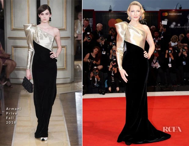4. Cate Blanchett no Festival de Veneza, 2018; amigos de longa data, Cate usou um vestido com bustos dourados e tecido aveludado preto, mostrando a elegância minimalista que é assinatura registrada de Armani.