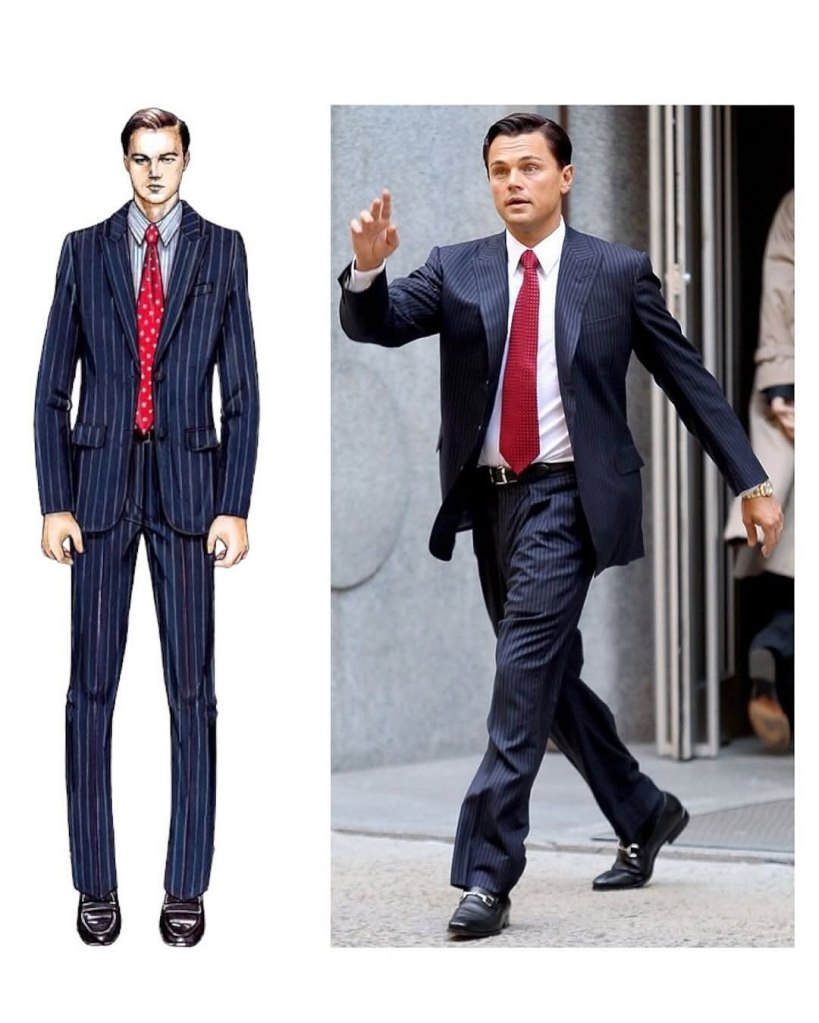 2. Leonardo Di Caprio em O Lobo de Wall Street, 2013; Armani disponibilizou seu acervo de peças para a figurinista Sandy Powell vestir Jordan, que procurava um terno que fosse maleável, mas estruturado, fazendo jus ao personagem.