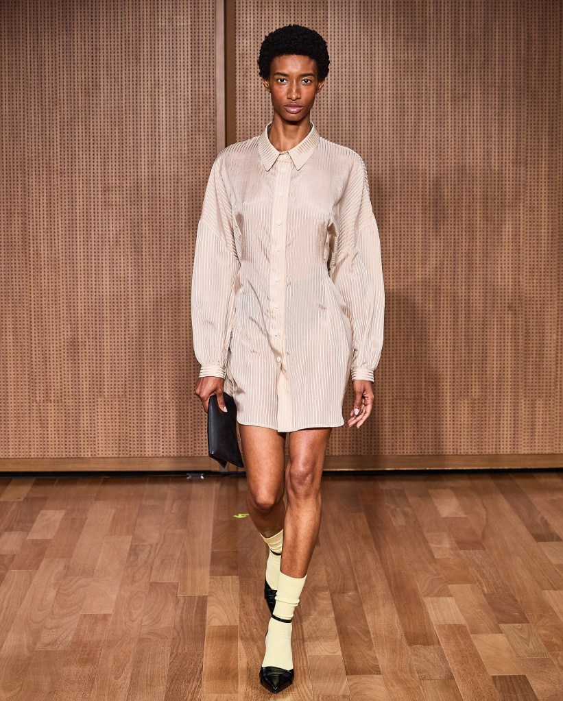 - Casual e esportivo: a marca fez um mix de roupas mais descontraídas e confortáveis, elevando o visual do dia a dia e do esporte. Vimos exercícios em camisaria branca (a camisa social, peça básica, reinventada de formas criativas) e os surpreendentes moletons feitos com acabamento super refinado e detalhes elaborados, dignos de alta costura. Além disso, surgiram jaquetas práticas com zíperes e looks que faziam uma brincadeira com o íntimo, sendo inspirados em detalhes de lingeries com transparências e rendas.