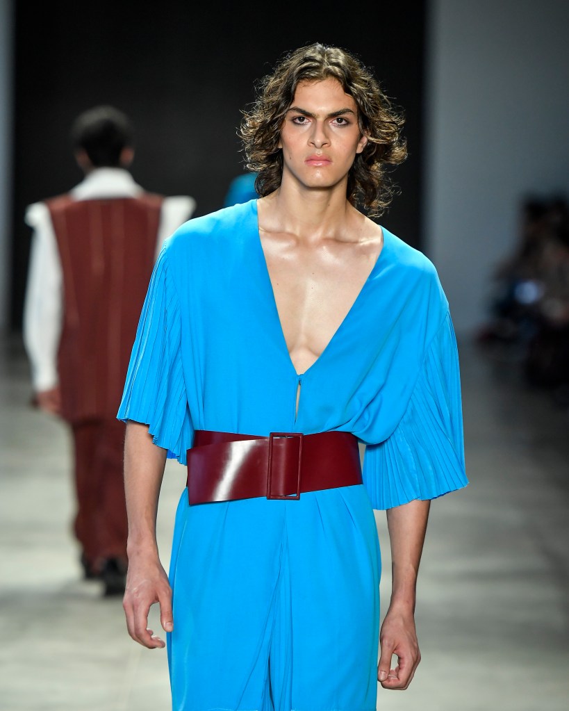A alfaiataria é subvertida quando Caetano muda pregas e lapelas de lugar, como no detalhe de uma lapela que se estende. Essa desestruturação estratégica retira a rigidez do traje formal, garantindo que mesmo os blazers mais definidos se mantenham soltos e flexíveis.