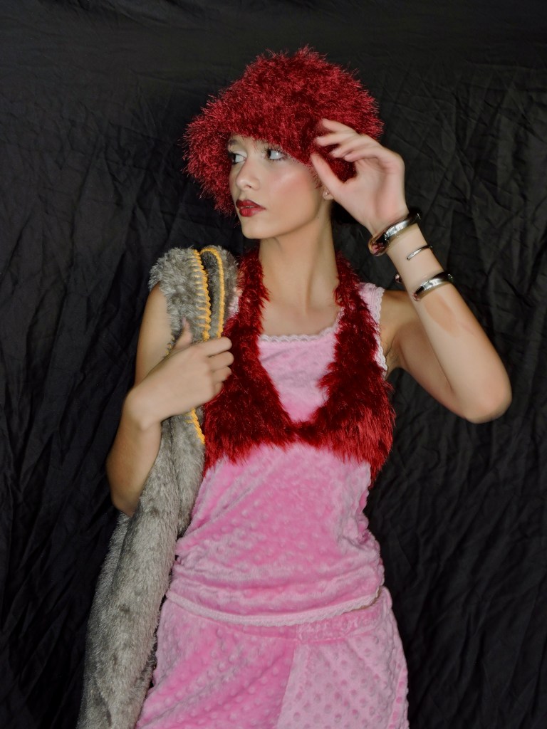A coleção mistura diferentes texturas, cores e modelagens, amarrados em uma estética completamente camp. O fuzzy é o ponto-chave da proposta e surge em peças de crochê e tricô. Carregadas de humor, as peças foram desenvolvidas a partir de uma produção autoral e artesanal, com releituras irônicas daquilo que muitos consideram “cafona”, mas que, para a diretora criativa, tem um significado totalmente diferente.